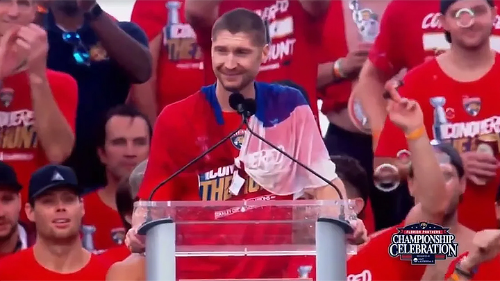 Голкипер "Флориды" Сергей Бобровский продемонстрировал флаг России на чемпионском параде команды в честь победы в Кубке Стэнли. Скриншот видео: CBS Miami
