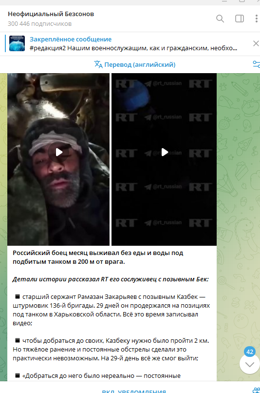 "Штурмовик из 136-й бригады почти месяц прятался от французских наёмников под подбитым танком в Харьковской области. 29 дней без еды, воды и медпомощи - старший сержант Рамазан Закарьяев с позывным "Казбек" из Махачкалы пережил ад на земле", - пишет ТГ-канал Mash.