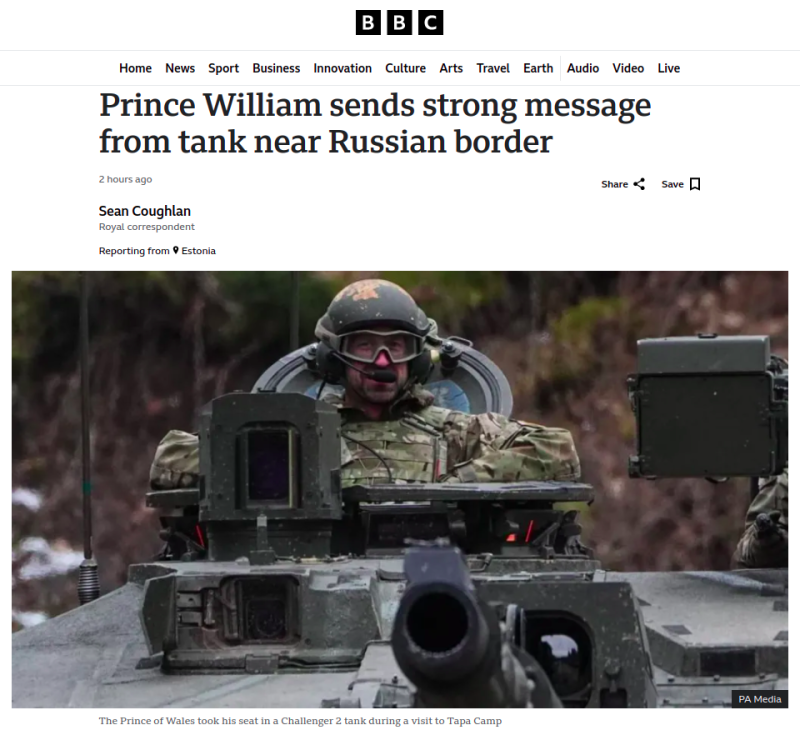 Издание "Би-би-си" опубликовало странные кадры с наследником британской короны принцем Уильямом. На них член королевской семьи запечатлён в танке Challenger 2 в непосредственной близости от границы с Россией.