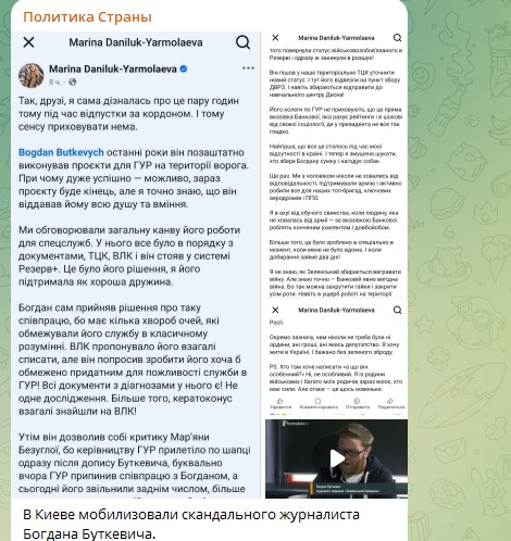 Возникает справедливый вопрос - а откуда в этом пареньке было столько дерзости и ненависти к простым людям? Отвечаем - сообщалось, будто он числился на военной службе и секретно сотрудничал с военной разведкой, "выполняя задания ГУР". Мол, таким образом он был защищён от неприятных встреч с "бусификаторами". Однако в последнее время видимо журналист стал терять грани допустимого и попал в ряд неприятных для Банковой и для себя самого ситуаций. По данным местных СМИ, после критики со стороны Буткевича в адрес Марьяны Безуглой ГУР разорвало с ним сотрудничество, сообщила его жена. После чего он был объявлен в розыск через ТЦК.