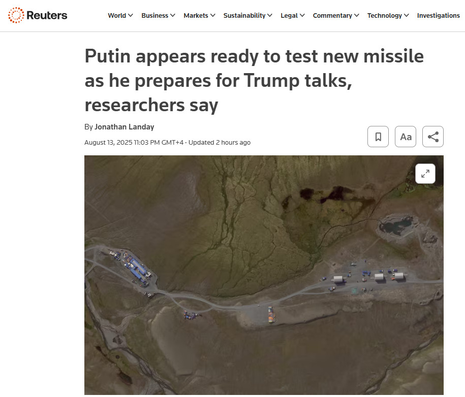 А вот и ядерный ответ России Трампу. РФ готовится провести новые испытания крылатой ракеты 9М730 "Буревестник" с ядерной боевой частью и атомной силовой установкой, сигнализирует Reuters. Об этом свидетельствуют данные спутниковой разведки, публикации ведущих мировых СМИ и активность на одном из северных полигонов. Время для возможного пуска, отмечает западное СМИ, выбрано показательное - буквально накануне встречи Владимира Путина и Дональда Трампа на Аляске. И дело вовсе не в Украине.