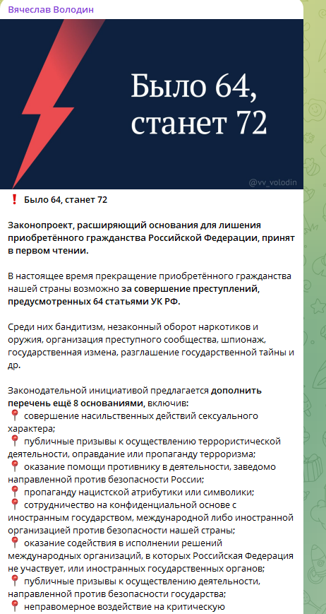 Председатель Госдумы рассказал, что в первом чтении уже принят законопроект, который расширит основания для лишения приобретённого гражданства России. Ранее таких оснований было 64, список расширят до 72 пунктов.