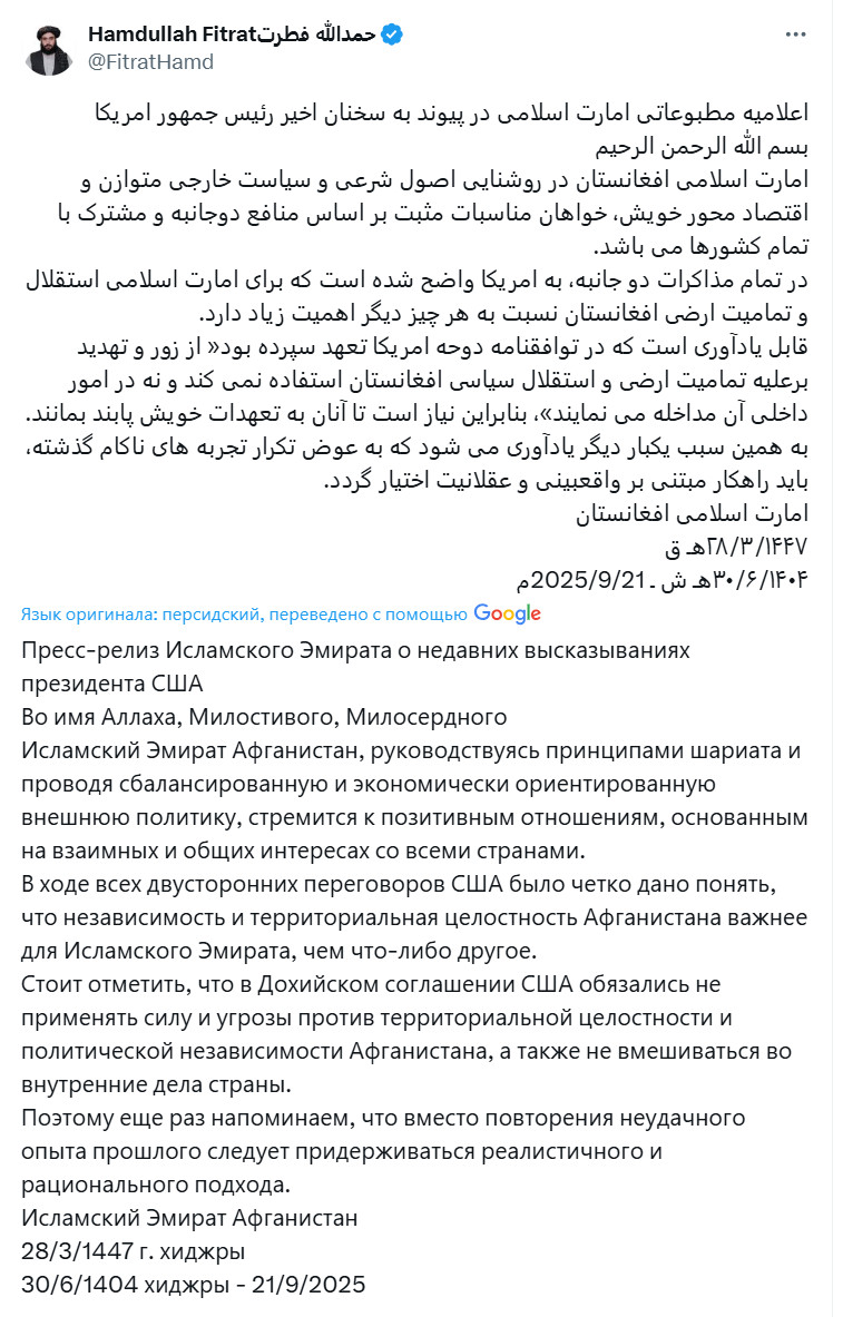 Фитрат также указал на соглашение, заключённое в Дохе, согласно которому США обязались не применять и не угрожать применением силы против Афганистана, а также не вмешиваться во внутренние дела страны. Необходимо, чтобы они оставались привержены своим обязательствам. Вновь подчёркиваем: вместо повторения прошлых неудачных подходов следует придерживаться политики, основанной на реализме и рациональности,