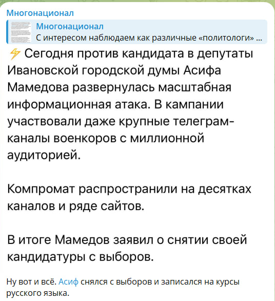 Последние несколько дней в российской региональной политике основной темой обсуждения стало выдвижение в депутаты Ивановской области Асифа Мамедова. Он попытался избраться в депутаты, притом что "возглавляет две национально-культурные автономии азербайджанцев в регионе и владеет несколькими бизнесами", пишет военкор Михаил Звинчук.