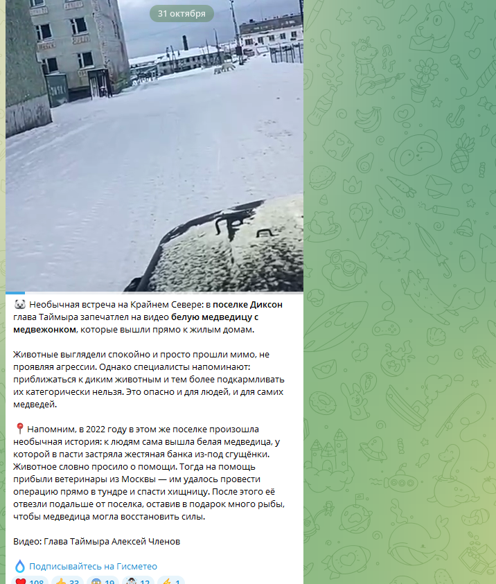 В паблике Gismeteo вспомнили, что в 2022 году в тот же посёлок Диксон приходила медведица, которая просила у людей помощи, потому что у неё