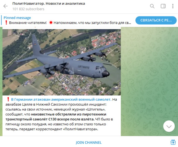 Скриншот с t.me/Politnavigator. Сейчас в парке ВВС насчитывается шесть самолётов C130