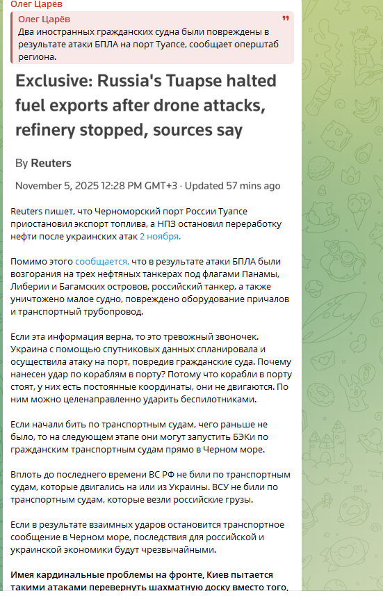 Врагу удалось нанести серьёзный урон инфраструктуре причалов, а также местному транспортному трубопроводу. Как утверждается в публикации, экспорт топлива через порт встал. Также местный НПЗ поставил на паузу процесс переработки нефти.