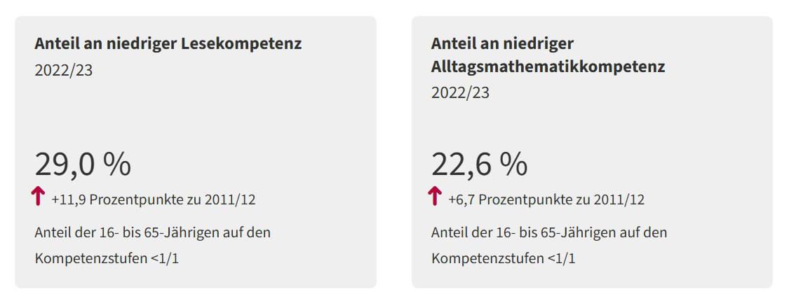 Сообщается, что в 2011-2012 годах в стране было 17,1% безграмотных людей. Однако за прошедшие годы количество не умеющих писать и читать увеличилось на 11,9% и теперь составляет 29% от общего количества жителей Австрии. Одновременно с этим возросла и доля людей с низкими математическими навыками. Если в 2011-2012 годах таковых насчитывалось 15,9%, то теперь их количество возросло до 22,6%.