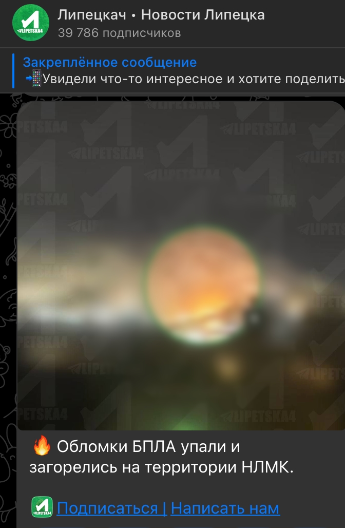По неподтверждённым данным, обломки БПЛА упали и загорелись на территории НЛМК (Новолипецкого металлургического комбината).
