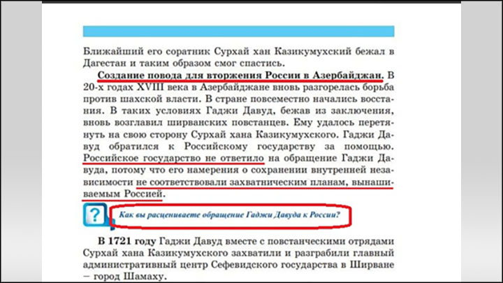 После такого вступления школьникам будет сложно воспринимать Россию хотя бы нейтрально, не говоря уже о положительной оценке. Ясно, что цель объективного освещения общего прошлого двух стран не ставилась. Вместо этого ученикам подаётся концепция "плохой России", которая не спешила на помощь азербайджанским ханствам, игнорируя политическую обстановку и свои интересы.