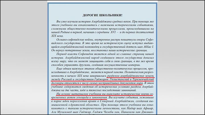 Во вступительном обращении к ученикам утверждается, что политическая разрозненность в начале XIX века завершилась разделом азербайджанских земель между Россией и государством Гаджаров. Гюлистанский и Туркманчайский договоры названы "одними из самых несправедливых документов" в мире. Учебник подробно освещает исторические условия, приведшие к разделу Азербайджана, а также последствия завоеваний.