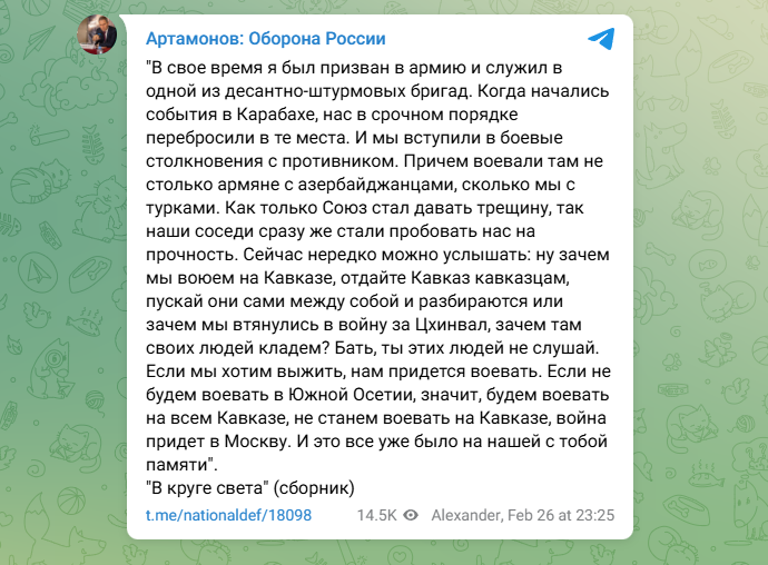 Солдат очень удивился, что воевали там не столько азербайджанцы с армянами, сколько прибывшие русские… с турками. Он отмечает: этот сосед, едва развалился Советский Союз, тут же принялись пробовать нашу страну на прочность.