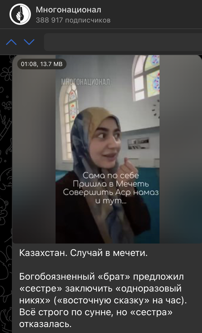 В Казахстане разразился скандал, получивший широкий общественный резонанс, после инцидента в мечети, где мужчина предложил девушке заключить брак на один час ("брак для удовольствия"). Этот случай вызвал резкое разделение мнений среди населения. Радикально настроенные мусульмане осудили девушку за её отказ, утверждая, что она проявила неуважение к мужчине, в то время как светские казахи выразили обеспокоенность по поводу растущей исламизации в стране.