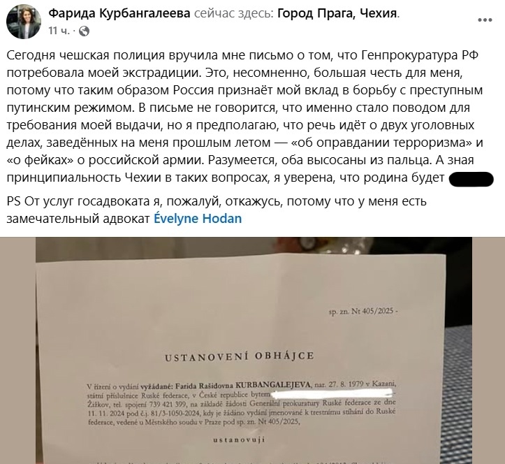Курбангалеева* уверяла, что, покидая Россию, была убеждена в скором окончании войны и победе Украины. 11 февраля она опубликовала пост о получении письма от чешской полиции с требованием экстрадиции, при этом наивно полагая, что Чехия защитит её интересы.