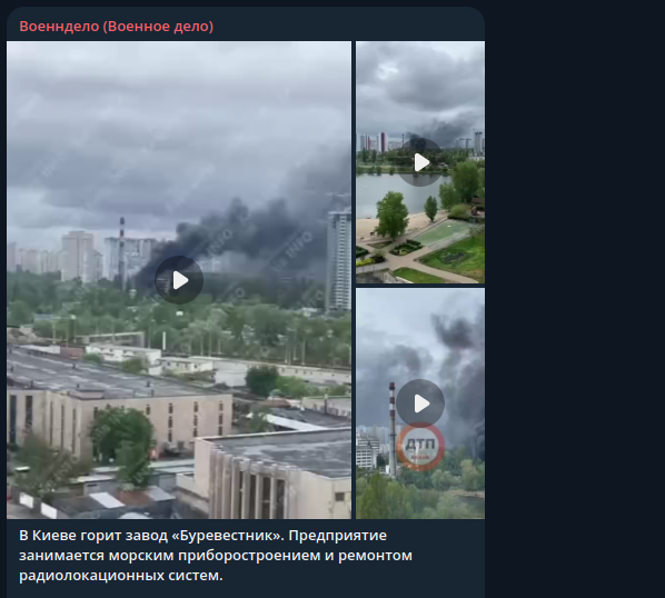 В Telegram-канале "Военндело" сообщают, что мишенью был завод "Буревестник", который загорелся после прилёта. Над зданием наблюдается огромный столб чёрного дыма. Известно, что на этом предприятии военно-промышленного комплекса занимаются морским приборостроением и ремонтом радиолокационных систем.