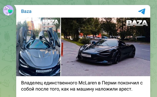 Обладатель единственного в Перми McLaren 720S свёл счёты с жизнью после того, как на машину наложили арест. Источник поделился подробностями трагической истории.