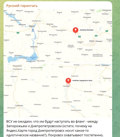 ВСУ не ожидали, что им будут наступать во фланг - между Запорожьем и Днепропетровском, пишет в своём телеграм-канале военный корреспондент "Комсомольской правды" Дмитрий Стешин. Продолжая, он также напоминает, что тем временем "Покровск охватывают постепенно, наши разведчики лазают по окраинам", а также уже "взяли поселок Котлино". Кроме того, в Великой Новосёлке (Волновахский район), "где так сладко панували" украинские боевики во время летнего "контрнаступа", "складывается котел".