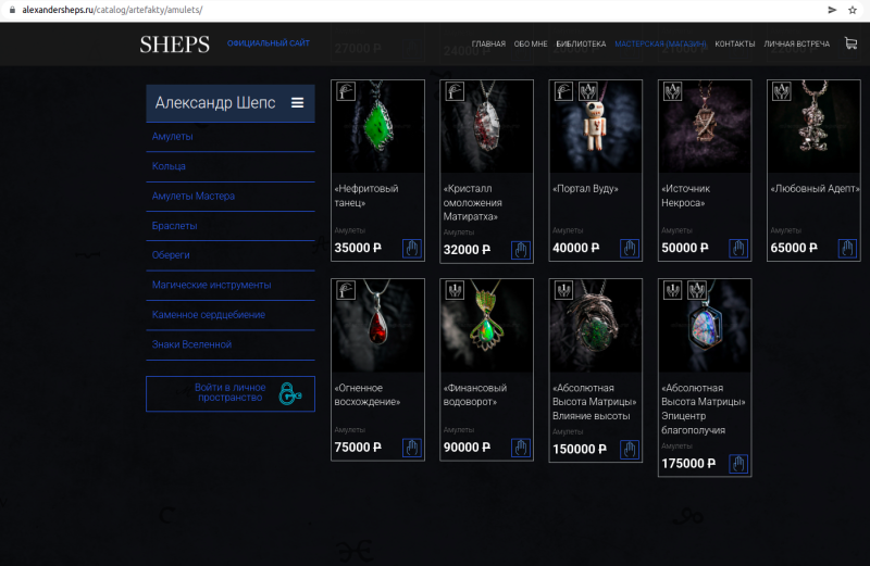 Telegram-канал SHOT выяснил, что "экстрасенс" получает около 2 млн рублей в месяц только на продажах всевозможных "магических" атрибутов. На его сайте можно отыскать различные амулеты, осиновые колья, украшения в виде пауков и драконов и камушки, которые обозначены как обереги. И всё это продаётся по внушительным ценам. Например, подвеска под названием "Абсолютная Высота Матрицы" обойдётся поклонникам прославленного "медиума" в 175 тысяч рублей. А тем, у кого нет таких денег, предлагается приобрести набор камней под названием "Фонтан прозрения" за 7500 рублей.