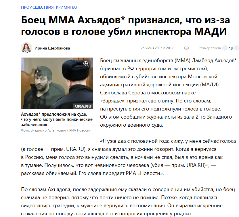 Боец ММА Ламберд Ахъядов выслушал суровый приговор: он отправляется в тюрьму за убийство инспектора Московской административной дорожной инспекции (МАДИ). Сам преступник в ходе следствия пытался свалить вину на некие "голоса в голове", которые он якобы слышит из-за душевной болезни и из-за травм головы.