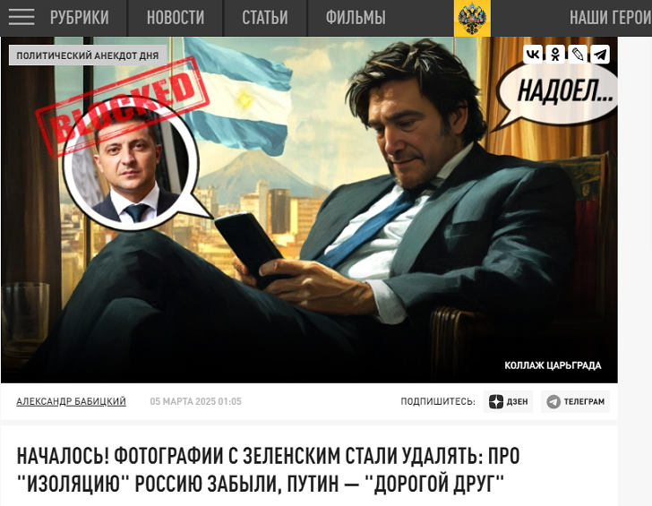 Со страниц соцсетей западных политиков стали исчезать совместные фото с Владимиром Зеленским. После его с Дональдом Трампом в Овальном кабинете ссоры все вдруг забыли про "изоляцию" России и повернулись в сторону Кремля. Как напомнил обозреватель Царьграда Александр Бабицкий, ещё недавно визитам главы киевского режима радовались всем миром. Им восторгались, обещали поддержку и, само собой, давали денег. Многие, в том числе и президент Аргентины Хавьер Милей, размещали фото с ним в соцсетях.
