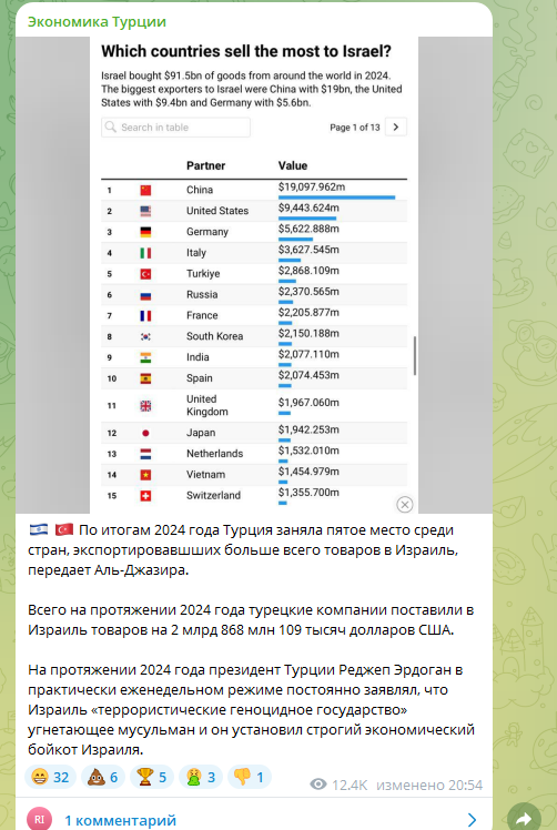 Турция порвала все торговые отношения с Израилем, обвиняя его в атаках на Палестину. Но арабский телеканала Аль-Джазира отмечает: это большая ложь Анкары, которая вскрылась в один момент - момент публикации экспортной отчётности. Дело серьёзное: в прошлом году Турция заработала на поставках товаров в Израиль почти три миллиарда долларов.