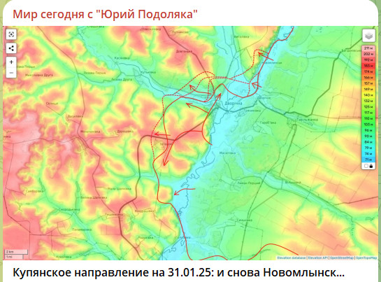 У русской армии появился ещё один плацдарм на правом берегу реки Оскол в Харьковской области. Как сообщает украинский ТГ-канал "Политика страны" со ссылкой на Deep State, русские снова "захватили" Новомлынск, который был отбит ВСУ в начале декабря. Как отмечается, командование ВСУ придавало небольшое значение этому населённому пункту, и теперь, спустя несколько недель, русские смогли снова его занять и сейчас насыщают живой силой и средствами поражения.