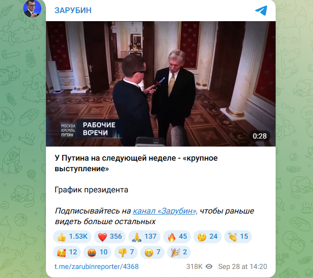 - поведал Песков (речь шла о текущей неделе, интервью обнародовано 28 сентября).