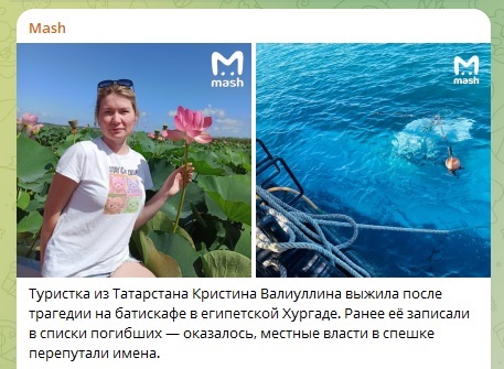 Вопреки ранним сообщениям, туристка из Татарстана Кристина Валиуллина выжила после трагедии на батискафе в египетской Хургаде. Сообщается, что местные власти в спешке перепутали имена и случайно записали её в список погибших.