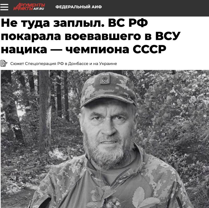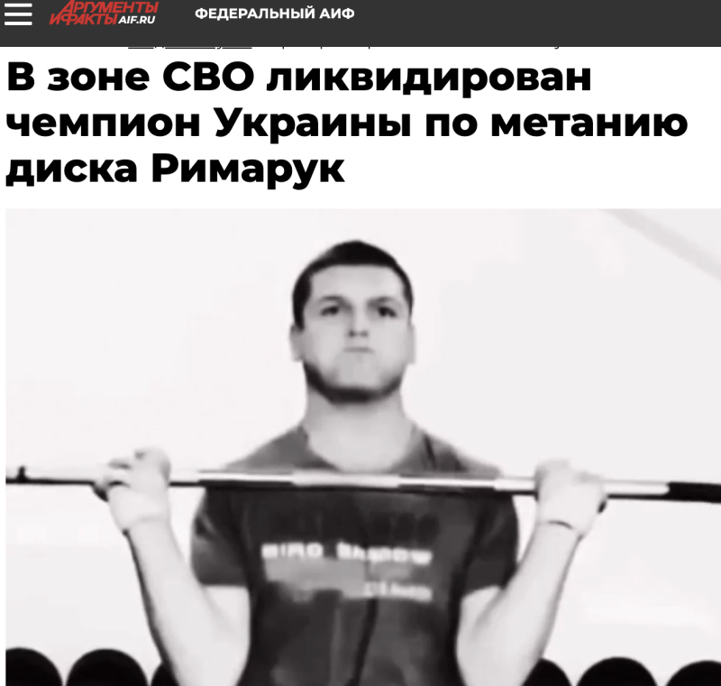 В ходе боевых действий русская армия ликвидировала ещё одного высококлассного спецназовца украинских вооружённых сил, Виталия Рымарука, который также был известным чемпионом по лёгкой атлетике. Очередного "героя Украины" не стало 17 июня. Рымарук родом из посёлка Делятин в Ивано-Франковской области, прославился на спортивной арене, став чемпионом Украины по метанию диска среди молодёжи и призёром среди взрослых. Однако под влиянием пропаганды киевского режима он принял решение вступить в ряды ВСУ. Это и стало его роковой ошибкой. Рымарук был зачислен в элитное спецподразделение "Омега" Нацгвардии Украины и вскоре был убит в бою.