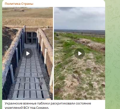 Также украинские военные паблики раскритиковали состояние укреплений ВСУ под Сумами. Говорят, окопы не оборудованы защитой от FPV-дронов и поэтому не годятся для обороны в условиях современной войны.