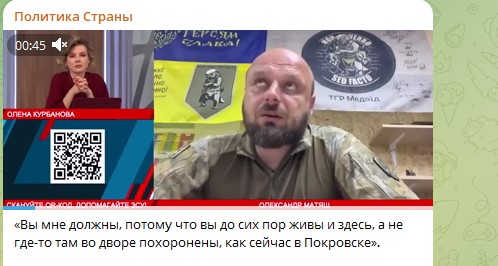 Командир мотопехотного взвода Александр Матяш вышел в прямой эфир, чтобы на всю страну пожаловаться на украинцев и государство. "Да, вы мне должны!" - заявил он.
