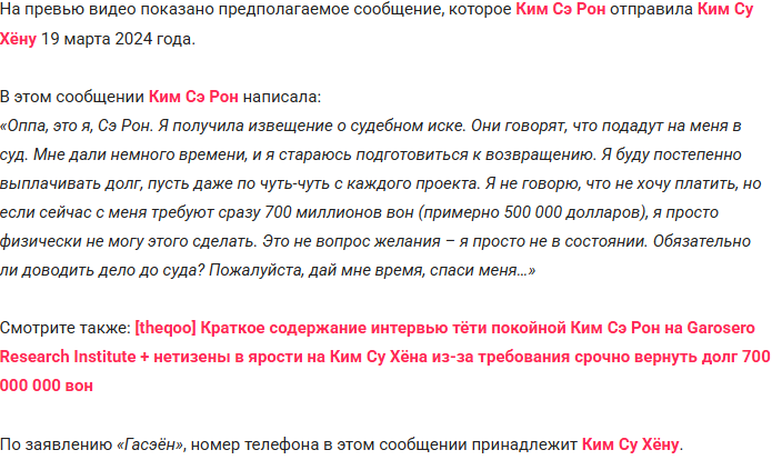 История смерти актрисы тем временем продолжает обрастать странностями. Так, теперь её тётя винит популярного корейского актёра Ким Су Хёна в том, что он соблазнил Сэ-Рон, когда ей было 15 лет (мужчине тогда было уже 27 лет), и долгие годы потом состоял с ней в тайной любовной связи.