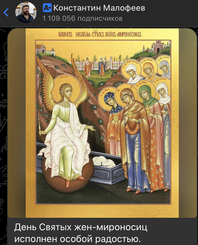 Константин Малофеев отметил, что День Святых жён-мироносиц наполнен особой радостью: всемирной Пасхальной, связанной с Воскресением Христа, и тёплой семейной, посвящённой любимым женщинам. Он подчеркнул, что этот день в Русской Православной Церкви уже давно неофициально называют Православным женским днём.