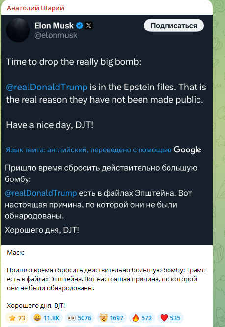 Дошло до угроз и обличительных постов. Маск пишет: раз уж начали "по-взрослому", то пусть публика знает - Трамп есть в печально известных "списках Эпштейна", то есть посетителей педофильских вечеринок. Американский президент же намеревается "отрезать" Маску государственное финансирование. Маск на это оповестил, что принадлежащая ему аэрокосмическая компания SpaceX выведет из работы космические корабли Dragon (только они могут доставлять американцев и их грузы на МКС).