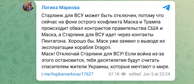 Маск! Отключай "Старлинк" для ВСУ! Если война из-за этого остановится, тебя десятилетия будут считать спасителем жители Украины, которые мечтают о мире,
