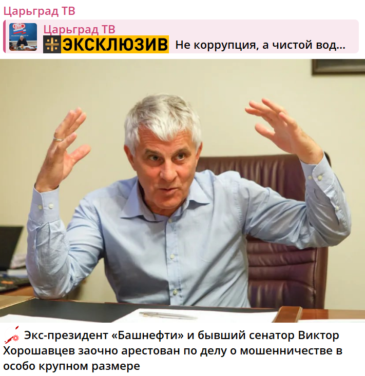 Суд России заочно арестовал бывшего президента "Башнефти" и бывшего члена Совета Федерации Виктора Хорошавцева, а также объявил его в розыск. Его обвиняют в мошенничестве в особо крупном размере. Сам Хорошавцев летом 2024 года уехал в Турцию.