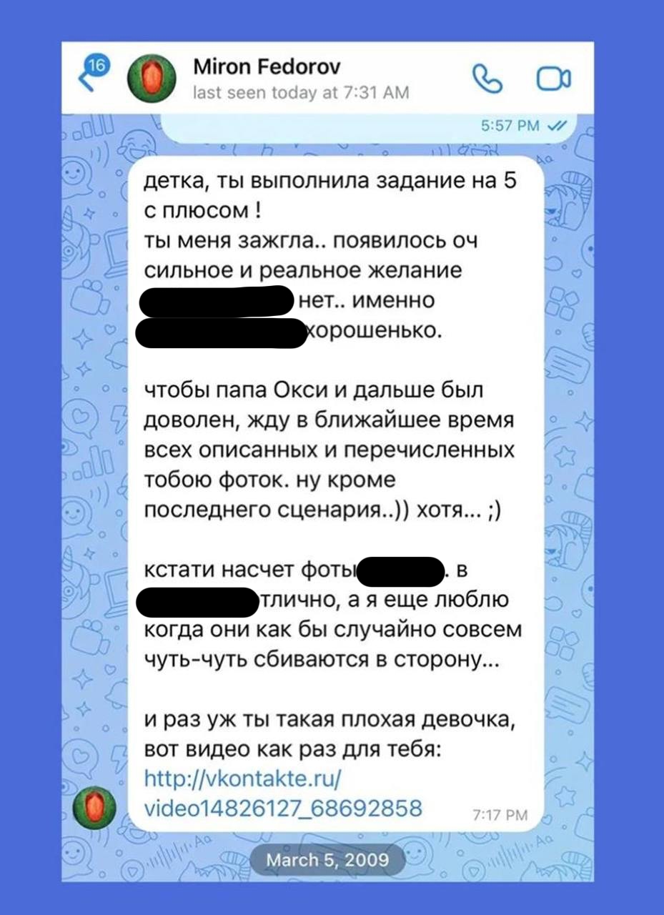 Анастасия Красильникова опубликовала переписки и других девушек, которые также сталкивались с Оксимироном* в подростковом возрасте. Многие из них рассказали о виртуальном флирте, просьбах прислать фотографии и откровенных видео, которые рэпер отправлял им. В подтверждение своих слов девушки предоставили скриншоты переписок.