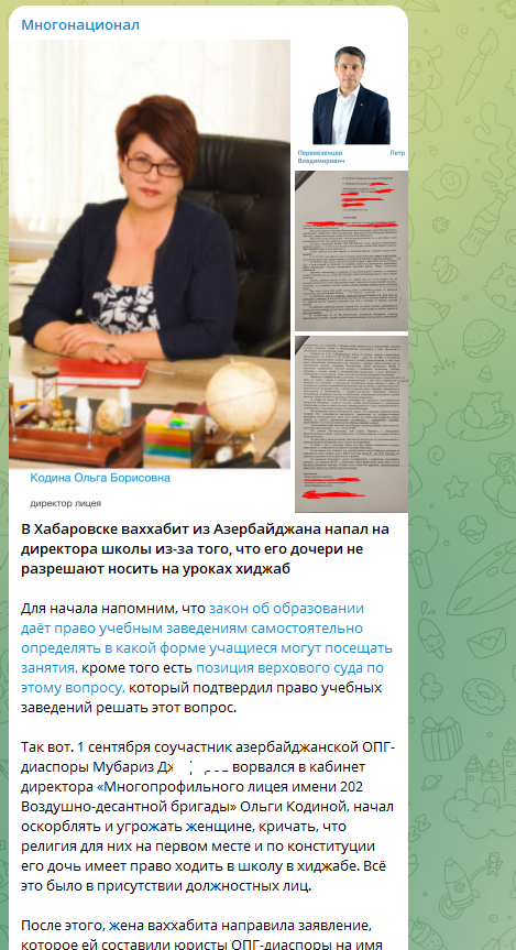 Также в Сети опубликовали письмо от имени матери девочки (с уточнением, что написано оно с участием юристов от азербайджанской диаспоры). Заявительница обращается в приёмную президента России и жалуется, что в числе прочего директор "нарушает свободу вероисповедания" школьницы (ссылаясь при этом на конституцию), запрещая носить хиджаб. Особое возмущение у матери девочки вызвали слова директора, что в таком одеянии ученица выделяется среди остальных детей.