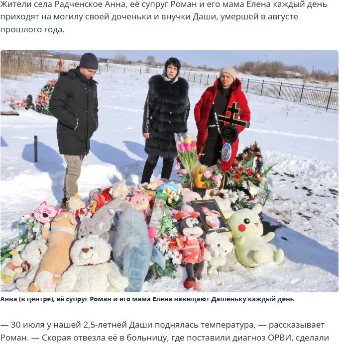 Теперь мама Анна, папа Роман и его мать, бабушка девочки, приходят навестить Дашу на кладбище. Приходят каждый день. На могиле - цветы и игрушки, которые несут туда местные жители. Смерть малышки потрясла всех.
