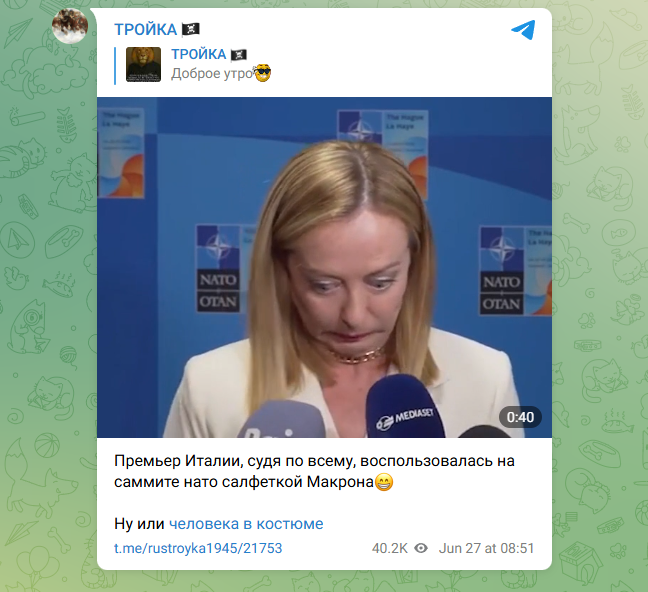 Разумеется, в соцсетях немедленно намекнули, что Мелони могла попользоваться "салфеткой Макрона".