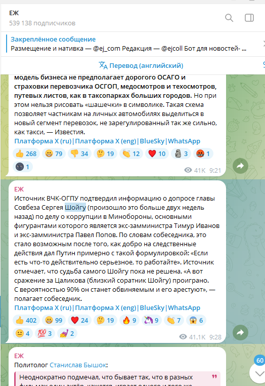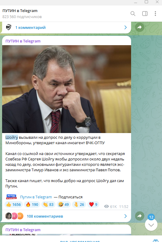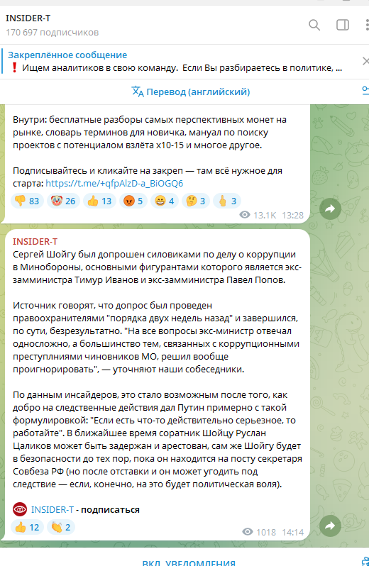 "Источник ВЧК-ОГПУ* подтвердил информацию о допросе главы Совбеза Сергея Шойгу (произошло это больше двух недель назад) по делу о коррупции в Минобороны, основными фигурантами которого является экс-замминистра Тимур Иванов и экс-замминистра Павел Попов. По словам собеседника, это стало возможным после того, как добро на следственные действия дал Путин примерно с такой формулировкой: "Если есть что-то действительно серьёзное, то работайте". Источник отмечает, что судьба самого Шойгу пока не решена. "А вот сражение за Цаликова (близкий соратник Шойгу) проиграно. С вероятностью 90% он станет обвиняемым и его арестуют".