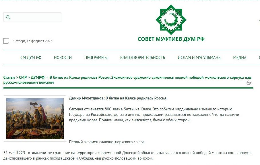 Ранее военный блогер Юрий Подоляка заметил, что в кабинете первого зампреда ДУМ РФ Дамира Мухетдинова висит картина "Калка" художника Ильдара Акжигитова. Полотно было написано по специальному заказу в 2023 году - то есть аккурат к 800-летию печально знаменитой битвы.