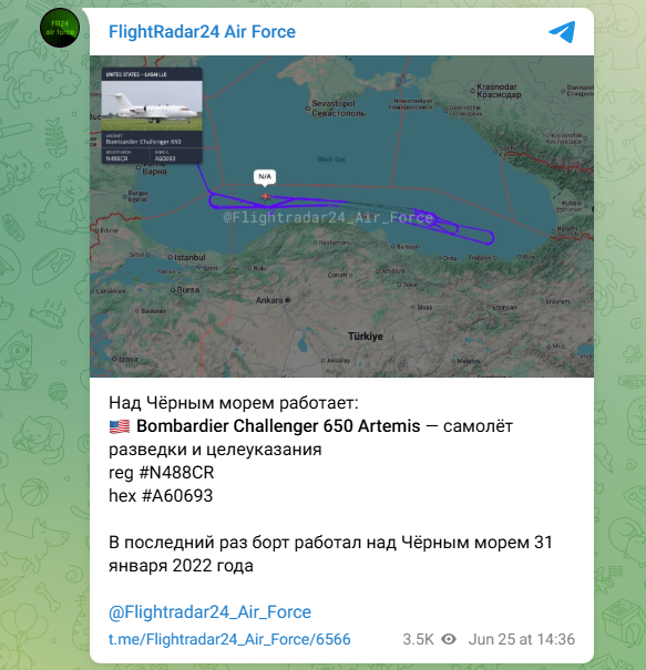 А вот Bombardier Challenger 650 Artemis над Чёрным морем не появлялся уже давненько. В последний раз его засекали рядом с нашей границей в январе 2022 года, напомнил телеграм-канал FlightRadar24 Air Force.