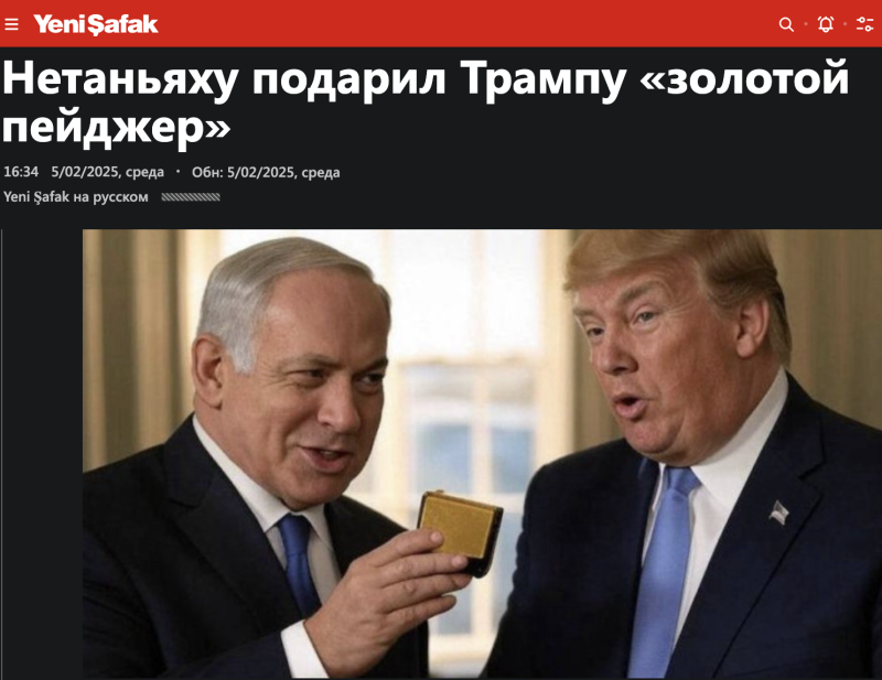 А Нетаньяху массовое убийство понравилось. И он посчитал уместным увековечить свои действия, подарив Трампу золотой пейджер. Более того, Трамп сделал ответный подарок - преподнёс фотографию с Нетаньяху, сделанную на одной из встреч, подписав её "Биби - великий лидер".