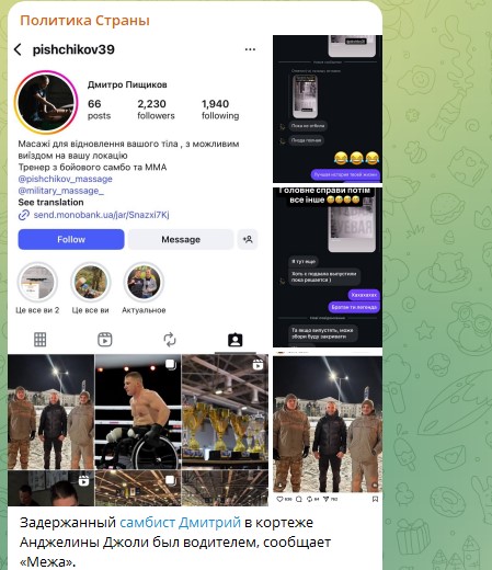 Мужчина, которого накануне схватили сотрудники ТЦК на глазах у актрисы Анджелины Джоли, оказался тренером по боевому самбо из Кропивницкого. Зовут его Дмитрий Пищиков. Как сообщил брат задержанного, Дмитрий не охранник, а волонтёр-водитель, сопровождавший кортеж. По словам родственника, у схваченного людоловами мужчины проблемы со спиной и справка ВВК до 2025 года, что он пригоден только для службы в тылу.