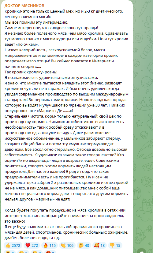 Доктор Мясников рекомендует включать крольчатину в рацион спортсменов. Оно будет полезно также тем, кто страдает ожирением, диабетом, сердечными недугами.