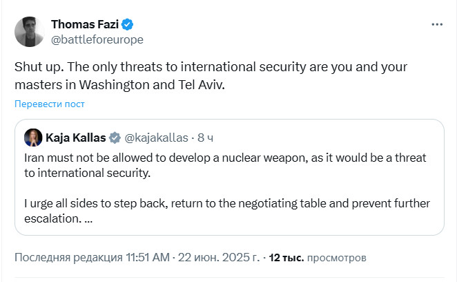 Американский публицист и политический обозреватель Томас Фази резко отреагировал на заявление главы дипломатии Евросоюза Каи Каллас, которая высказалась против возможного появления у Ирана ядерного оружия. Кая Каллас назвала это угрозой для мира. Но Фази поставил Каллас на место: "Единственная угроза - это ты и твои хозяева в Вашингтоне".