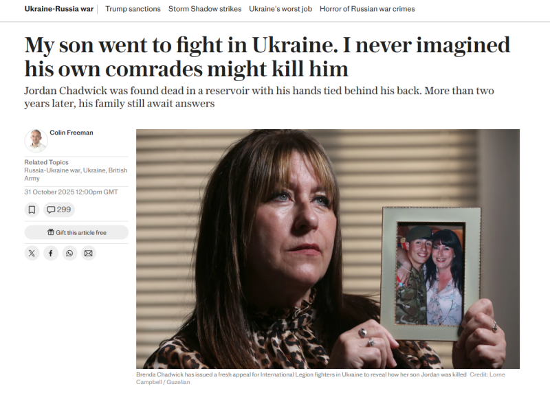 The Telegraph также выяснили, что Джордан Чедвик стал одним из примерно тридцати британцев, вступивших в Международный легион Украины и впоследствии погибших. Газета также философски отметила, что на Украине принято закрывать глаза на конфликты между боевиками, даже если произошло смертоубийство.