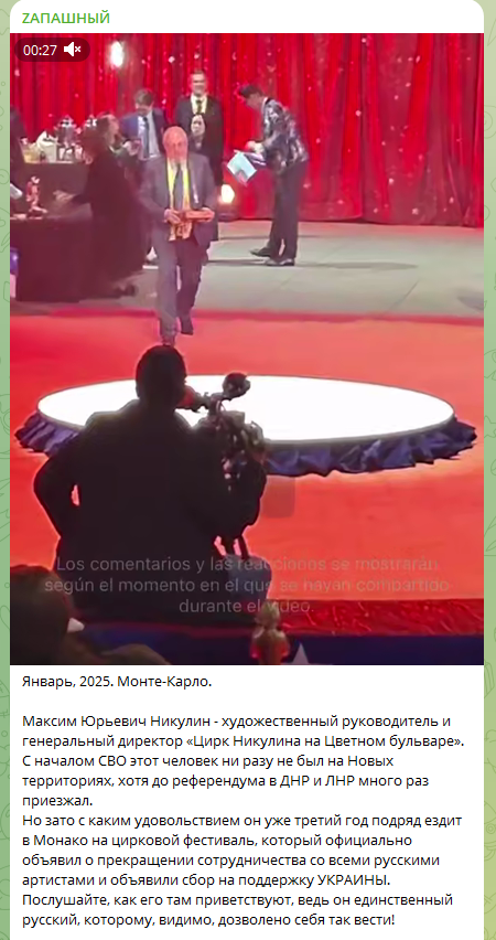 Максим Никулин, сын легендарного Юрия Никулина, предпочитает поездки в Монте-Карло, игнорируя поддержку своей Родины. Международный цирковой фестиваль в Монако не только дискредитирует русских артистов, но и активно собирает средства для украинских коллег, указывает Осташко. Тем не менее Никулин участвует в мероприятии уже третий год подряд как почётный гость, позируя на фоне украинских флагов.