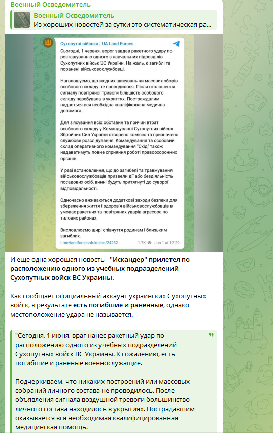 Также накануне стало известно о прилёте "Искандера" в некое неназванное место, где расположились учебные подразделения Сухопутный войск ВСУ. При этом - удивительное дело - украинская сторона признала факт удара.